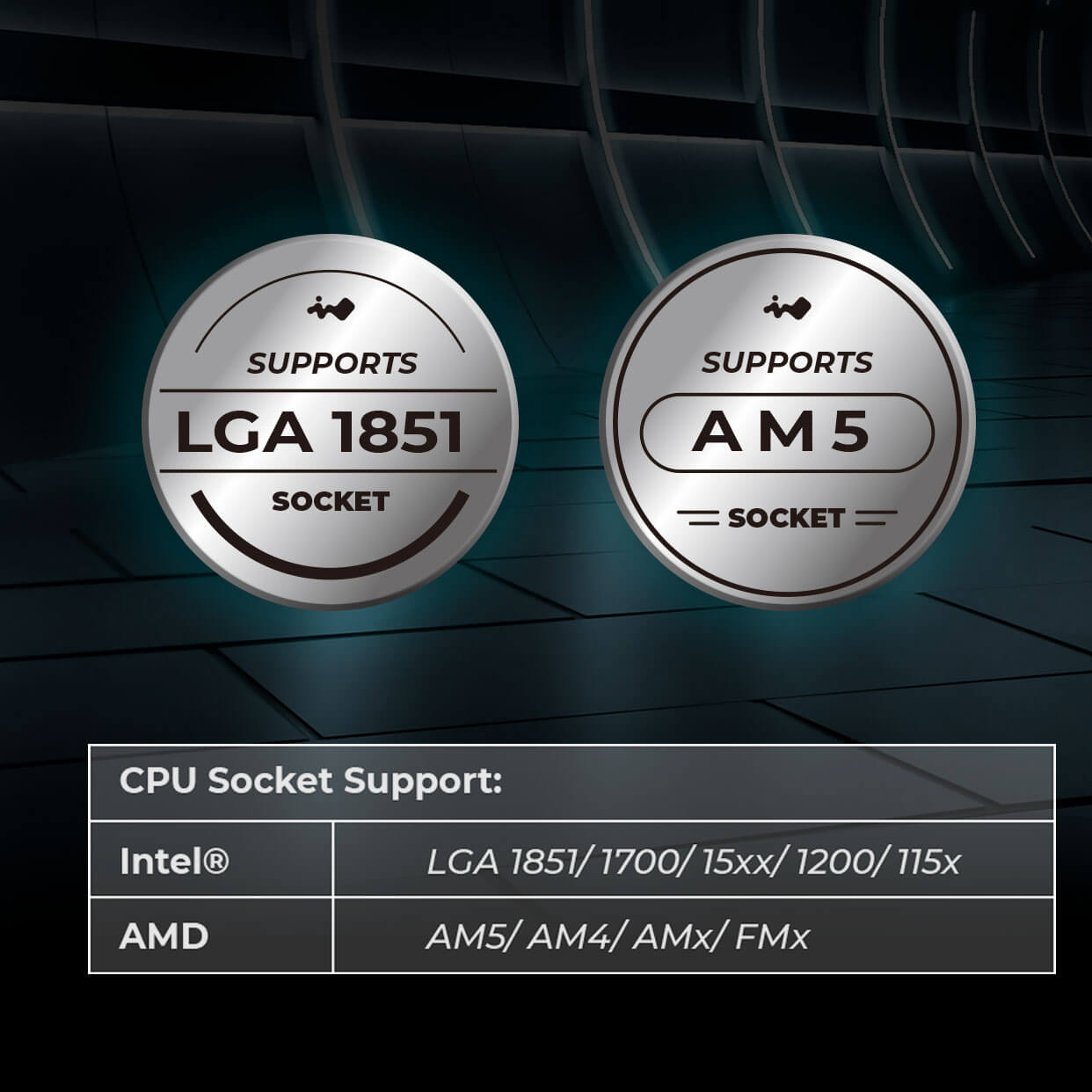 CPU Socket Support | Intel® LGA 1851/ 1700/ 15xx/ 1200/ 115x AMD AMD AM5/ AM4/ AMx/ FMx |