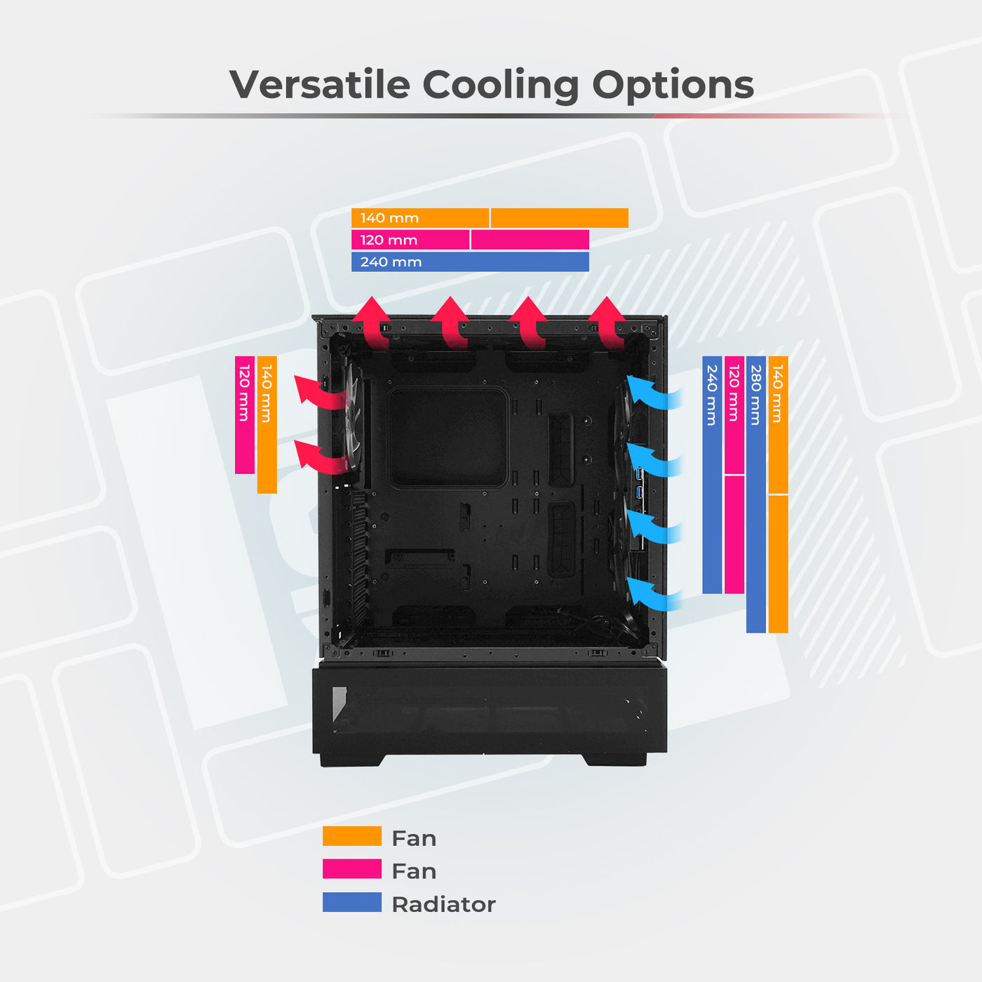 Air Cooling Fans: Front : 2 x 120 / 140 mm (2 x AJ140 pre-installed) Top : 2 x 120 / 140 mm Rear : 1 x 120 / 140 mm (1 x AJ140 pre-installed) Water Cooling Radiator: Front : 1 x 240 / 280 mm Top : 1 x 240 mm |