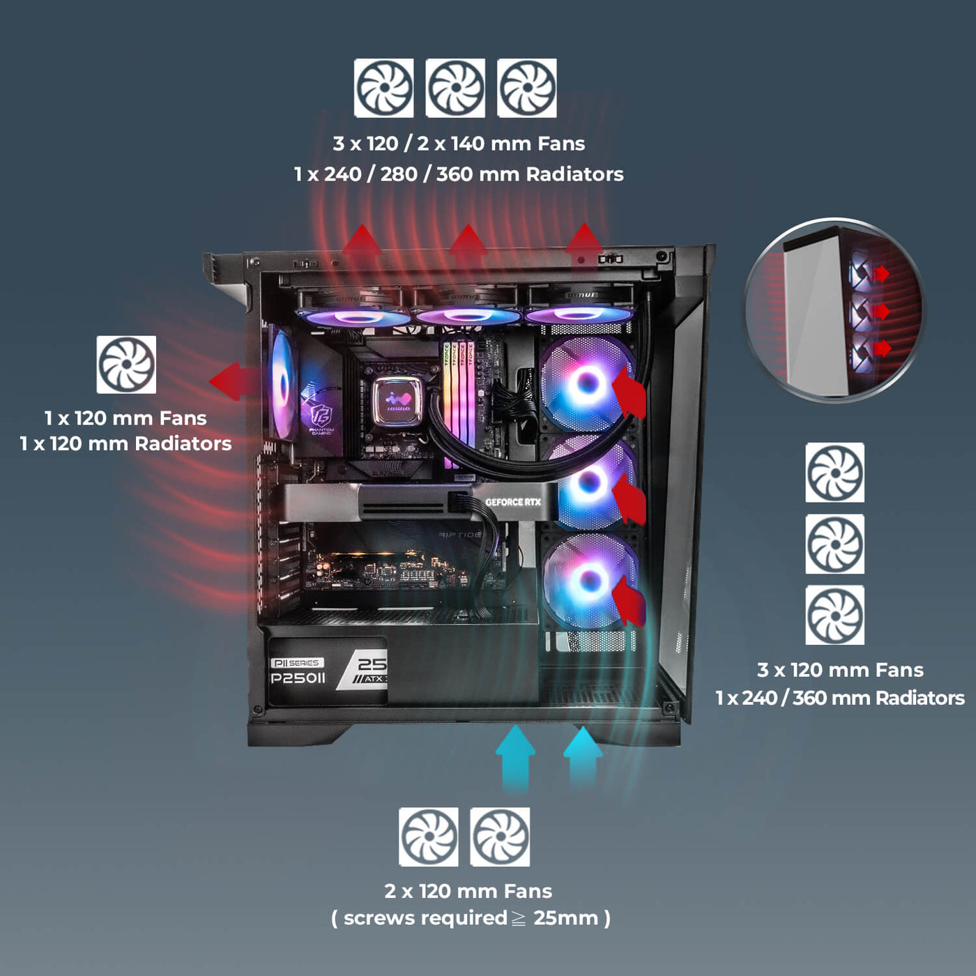 | Thermal Solution Compatibility | Air Cooling Fans: Top: 3 x 120 / 2 x 140 mm Rear: 1 x 120 mm (VX120 pre-installed) Bottom: 2 x 120 mm (screws required ≧ 25 mm) Side: 3 x 120 mm (VX120 pre-installed) Water Cooling Radiators: Top: 1 x 240/ 280 / 360 mm Rear: 1 x 120 mm Side: 1 x 240 / 360 mm |